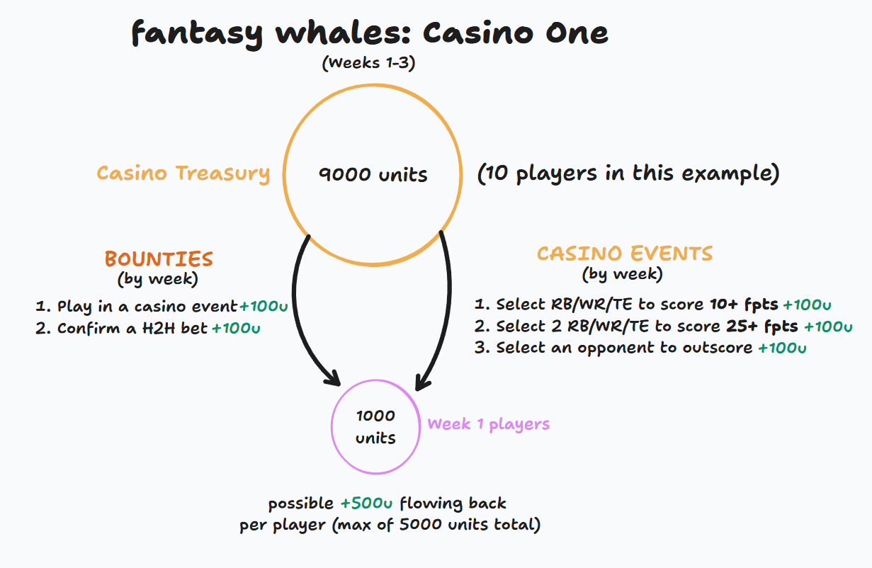 In Casino One (weeks 1-3), players must try their luck in the weekly casino events and complete bounties to get their units back in +100u payments. The below example is a macro view of how this all works, with an example 10-player league: