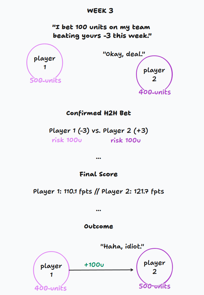 Each player starts with 100 units in Week 1. The first 3 weeks are a tutorial of sorts, letting players get familiar with the betting cadence and giving them some quick wins to start stacking units.